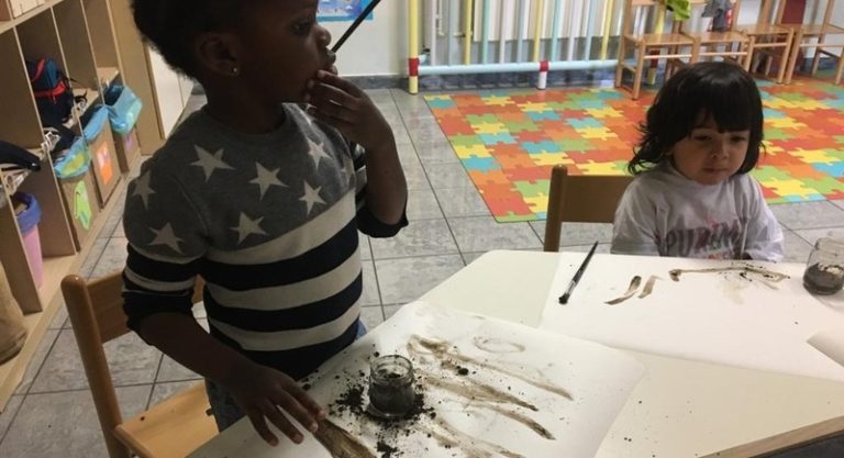 Anche la terra può essere molto scura, quasi nera, quindi le maestre portano in classe un po'di terriccio e con un pennello bagnato i bambini danno vita a storie fantastiche.